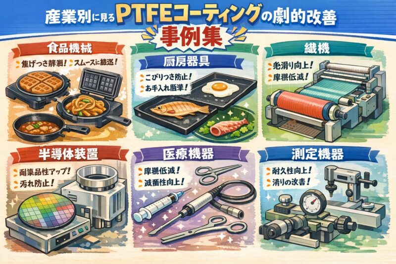機械のローラーや金型にPTFEをコーティングすると、汚れや付着物が劇的に減ります。フライパンの汚れがサッと落ちるのと同じ理屈で、機械の清掃時間が短縮され、工場の稼働率が上がります。